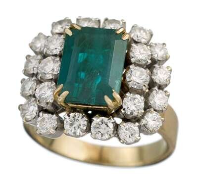 A synthetic emerald, diamond, platinum and fourteen karat gold ring