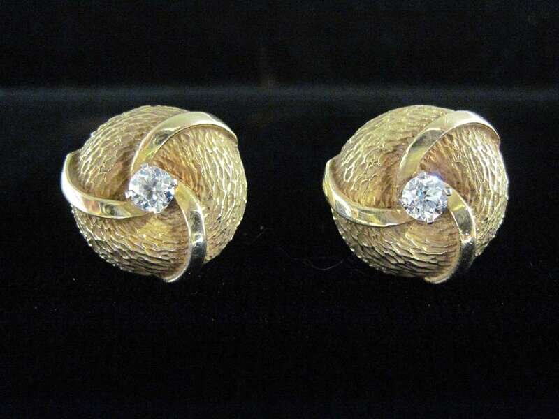 each centering a round brilliant-cut diamond in a textured and polished gold swirl motif; total diamond weight approximately: 0.75 carat.