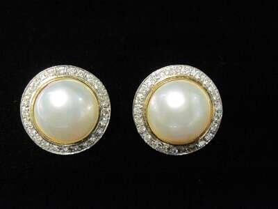 each centering one mabé pearl in a full-cut diamond surround; total diamond weight approximately: 1.55 carats.