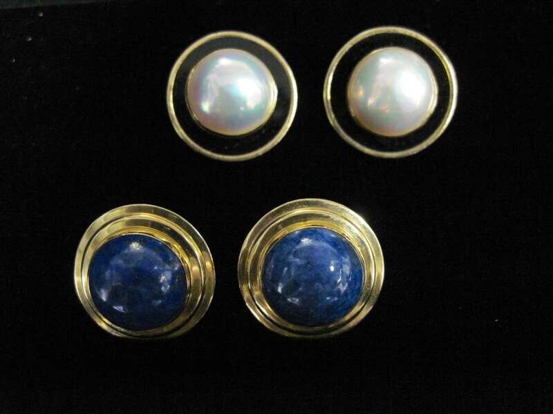 A collection of four pairs of cultured mabé pearl, gemstone and fourteen karat gold earrings