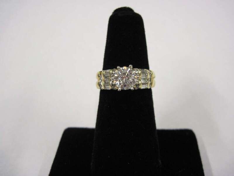 centering a round brilliant-cut diamond weighing: 0.80 carat; accented with full and baguette-cut diamonds.