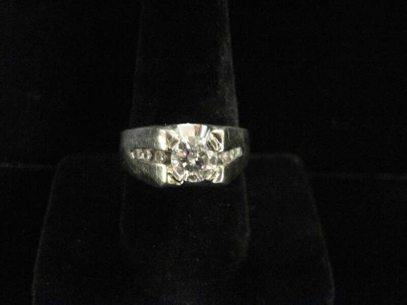 centering one round brilliant-cut diamond weighing 0.92 carat; flanked by round brilliant-cut diamonds.