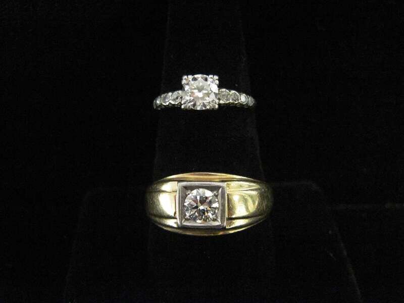 each centering one transitional-cut diamond weighing approximately: 0.50 and 0.60 carat; one with old mine and single-cut diamond accent stones.