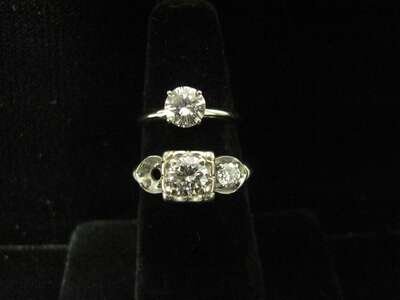 centering one round brilliant-cut diamond weighing approximately: 0.65 and 0.75 carat; one with a side stone.
