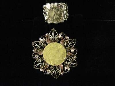 comprised of five coin rings, one coin brooch and one pendant, including two 1 dollar American coins, one Austrian coin, one 1 gram Credit Suisse. *Please note: only select items shown in image.