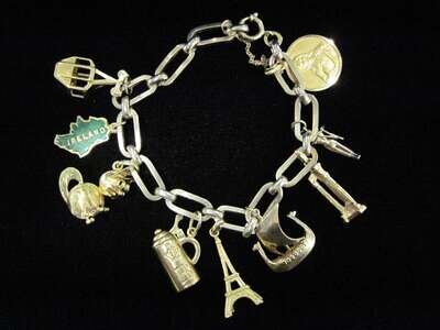 with nine, fourteen and eighteen karat gold charms of varying motifs on an eight karat gold bracelet.