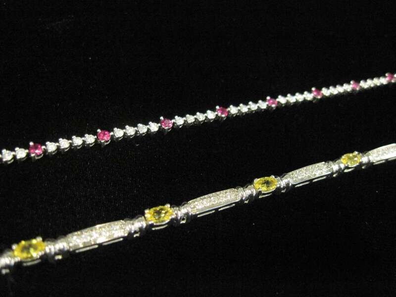 *A collection of two diamond, ruby, yellow sapphire and white gold line bracelets