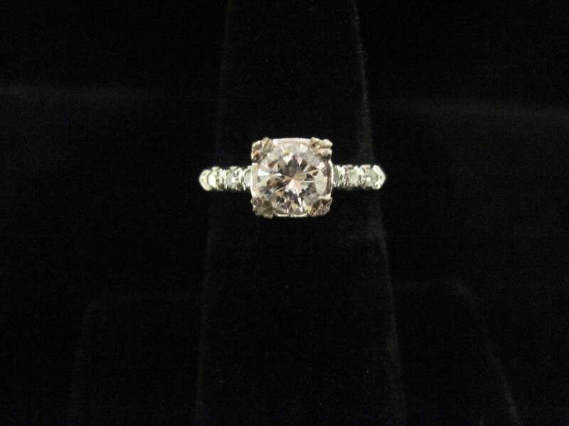 centering one round brilliant-cut diamond weighing approximately: 0.65 carat; with accent stones.