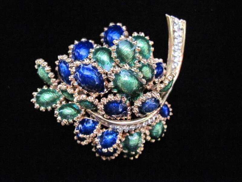 foliate spray motif with blue and green enamel and accented with full-cut diamonds; total diamond weight approximately: 0.40 carat.