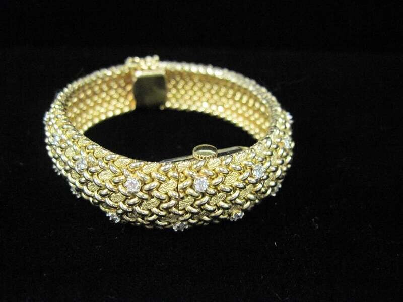 17 jewel Concord Watch movement, calibre 489, case no. 678657; textured and polished gold woven bracelet set with round brilliant-cut diamonds; total diamond weight approximately: 1.40 carats.
