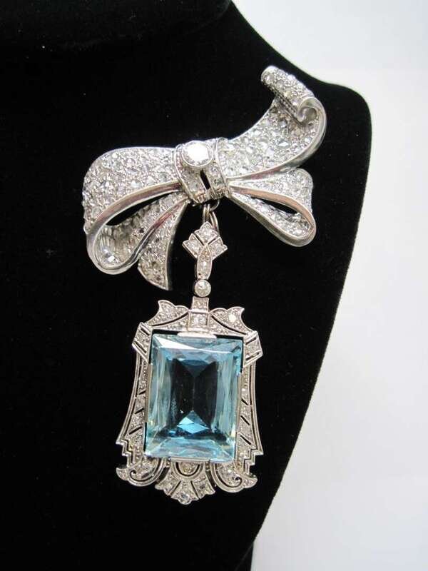 detachable pendant centering one scissor-cut aquamarine in a full and single-cut diamond millegrain surround; suspended from a rose-cut diamond bow brooch centering one transitional-cut diamond weighing approximately: 0.35 carat.