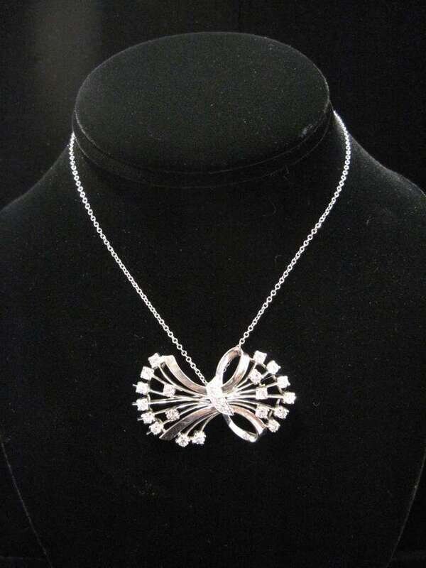 ribbon and spray motif set with round brilliant-cut diamonds; total diamond weight approximately: 2.75 carats; accompanied by chain.