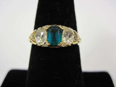 centering one step-cut emerald weighing approximately: 0.44 carat; flanked by old mine-cut diamonds; total diamond weight approximately: 0.75 carat.