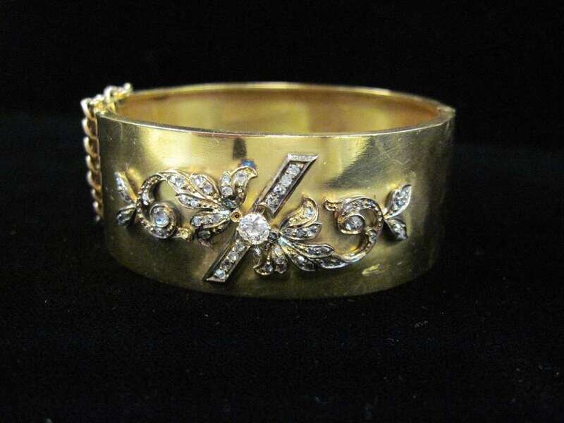 wide polished gold featuring diamond-set foliate motif; centering an old mine-cut diamond and accented with rose-cut diamonds.