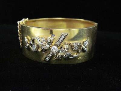 A diamond and fourteen karat gold wide bangle bracelet