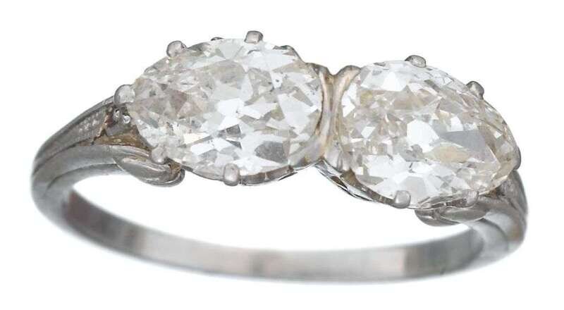 centering two old pear-shaped diamonds; total diamond weight approximately: 0.95 carat.