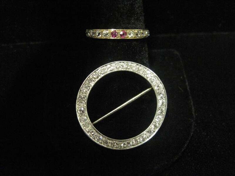 A diamond, pink sapphire, fourteen karat gold and platinum circle brooch and ring