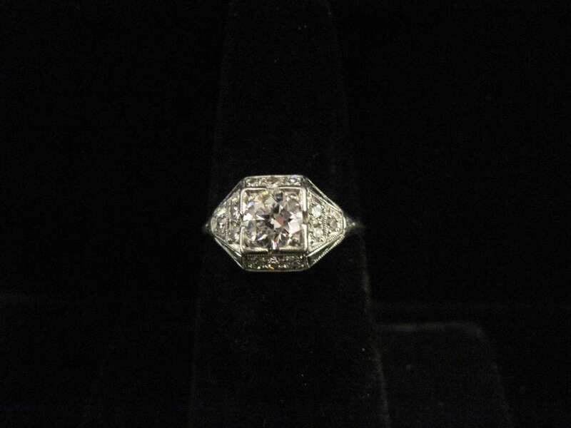 centering one old European-cut diamond weighing approximately: 0.60 carat and accented by single-cut diamonds.