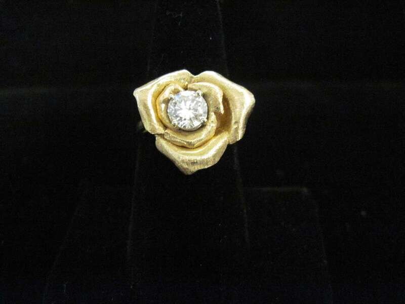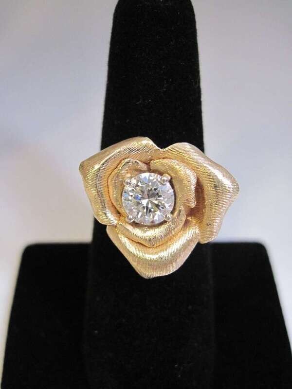 designed as a flower with florentine finished gold petals; centering one round brilliant-cut diamond weighing approximately: 1.15 carats.