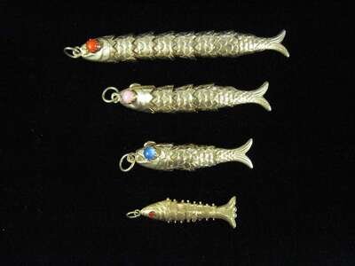 A collection of four simulant gemstone and eighteen karat gold fish charms italy