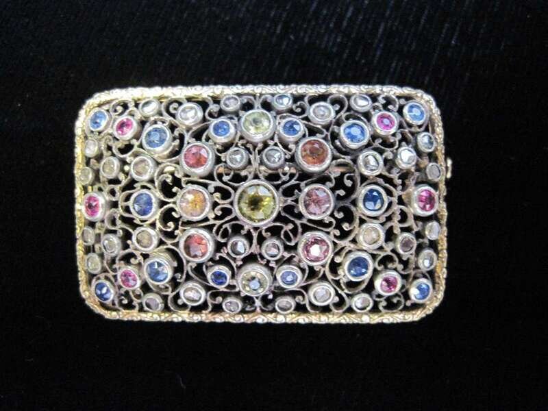 pierced scrolling motif set with various round-cut gems and rose-cut diamonds.