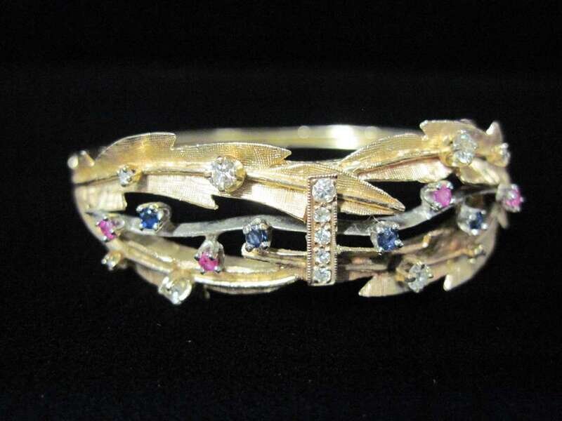 *A diamond, gem-set and fourteen karat gold bangle bracelet
