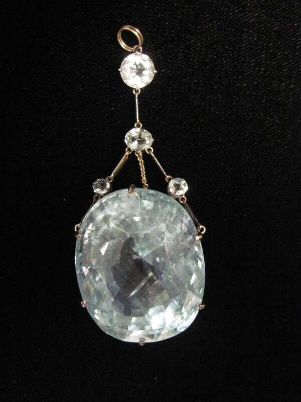 featuring a mixed-cut oval aquamarine measuring approximately: 38 x 30 x 26mm; suspended from three round-cut and one oval-cut aquamarines.