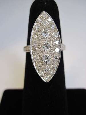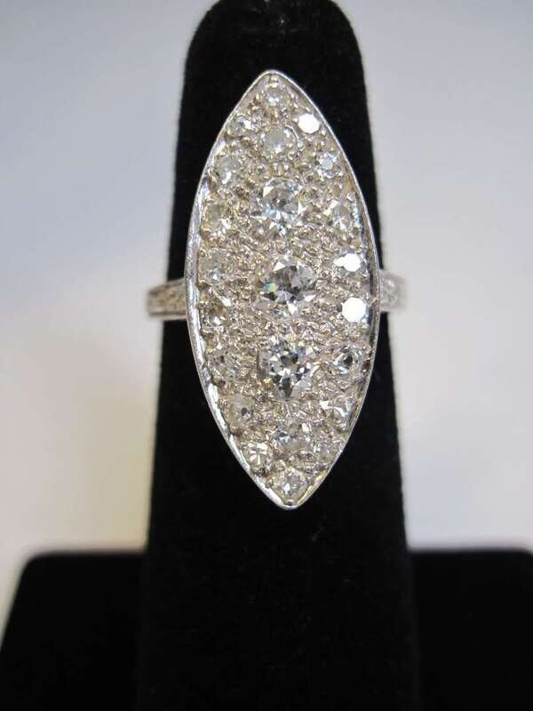 navette form set with old European and single-cut diamonds; total diamond weight approximately: 1.05 carats.