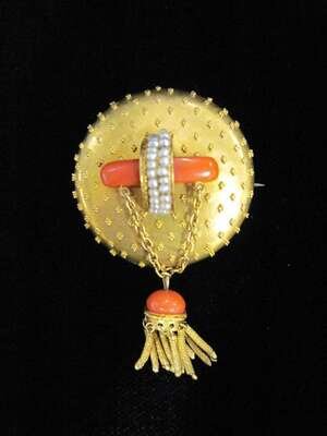 *A Victorian, coral, seed pearl and eighteen karat gold brooch and earrings