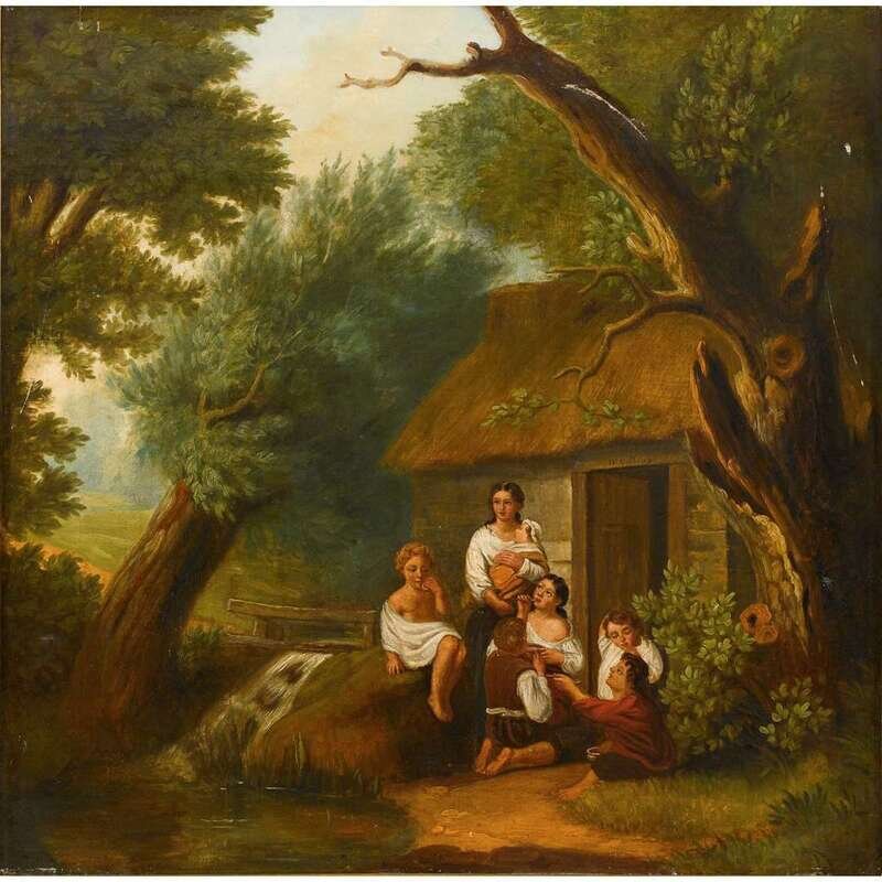 BRITISH SCHOOL (19TH CENTURY) MOTHER AND CHILDREN OUTSIDE A COTTAGE