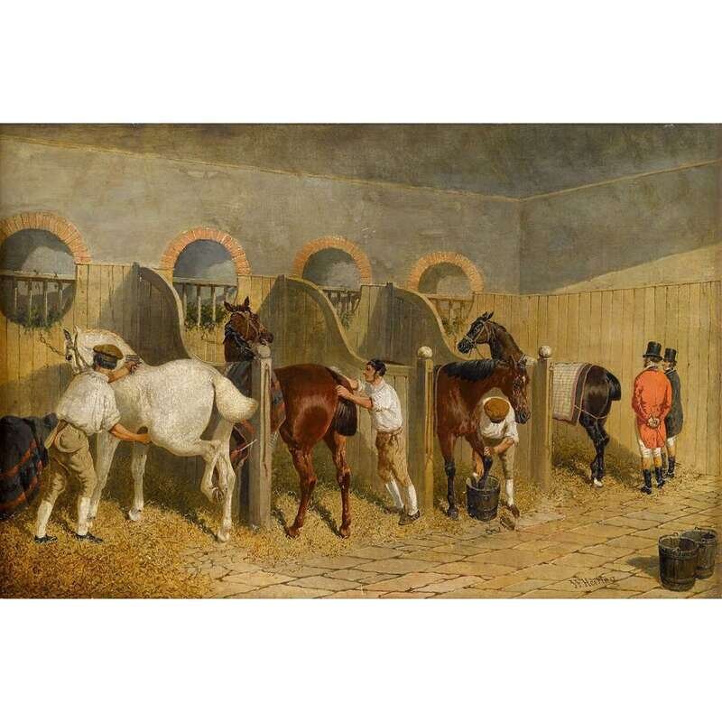 JOHN FREDERICK HERRING, SR. (BRITISH 1815-1907) GROOMS WITH BAYS, A GREY, AND A HUNTER IN THEIR STALLS