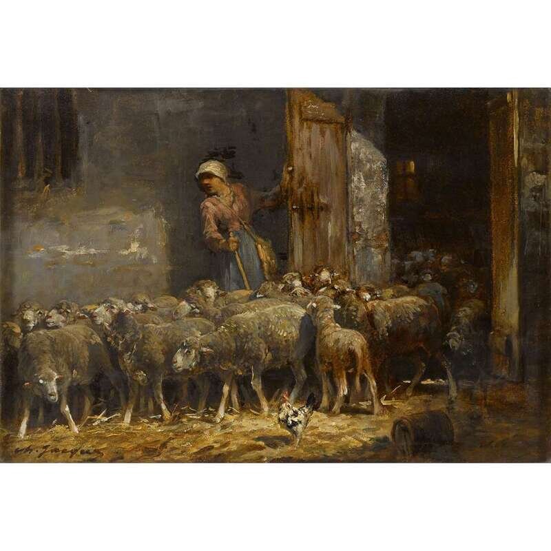 CHARLES ÉMILE JACQUE (FRENCH 1813-1894) SHEEPFOLD WITH SHEPHERDESS