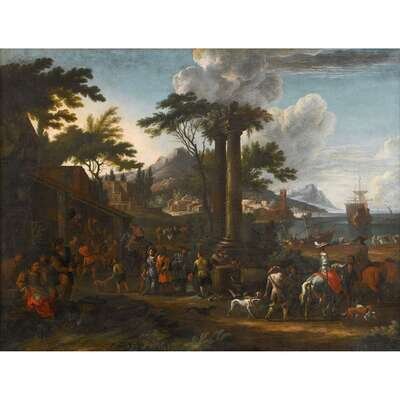 HENDRICH VAN MINDERHOUT (DUTCH 1632-1696) ITALIANATE LANDSCAPE WITH COOPERS, HUNTERS, AND OTHER FIGURES BY A HARBOR