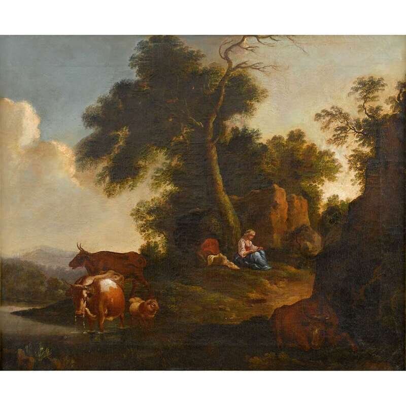 FOLLOWER OF NICOLAES BERCHEM (DUTCH 1620-1683) ARCADIAN LANDSCAPE WITH FIGURES AT REST AND CATTLE