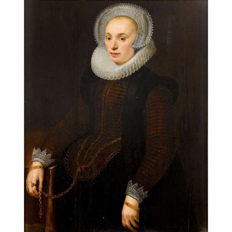CIRCLE OF NICOLAES ELIASZ PICKENOY (DUTCH CA.1588-1655) PORTRAIT OF A LADY, THREE-QUARTER LENGTH, WITH MOLENSTEENKRAAG, WHITE LACE COLLAR AND WHITE LACE HEADDRESS