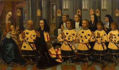 FLEMISH SCHOOL (LATE 16TH-EARLY 17TH CENTURY) WOUTER VAN DER NOOT, HIS WIFE DYMPHNA DE GRIMBERGEN, AND THEIR CHILDREN KNEELING BEFORE THE VIRGIN AND CHILD