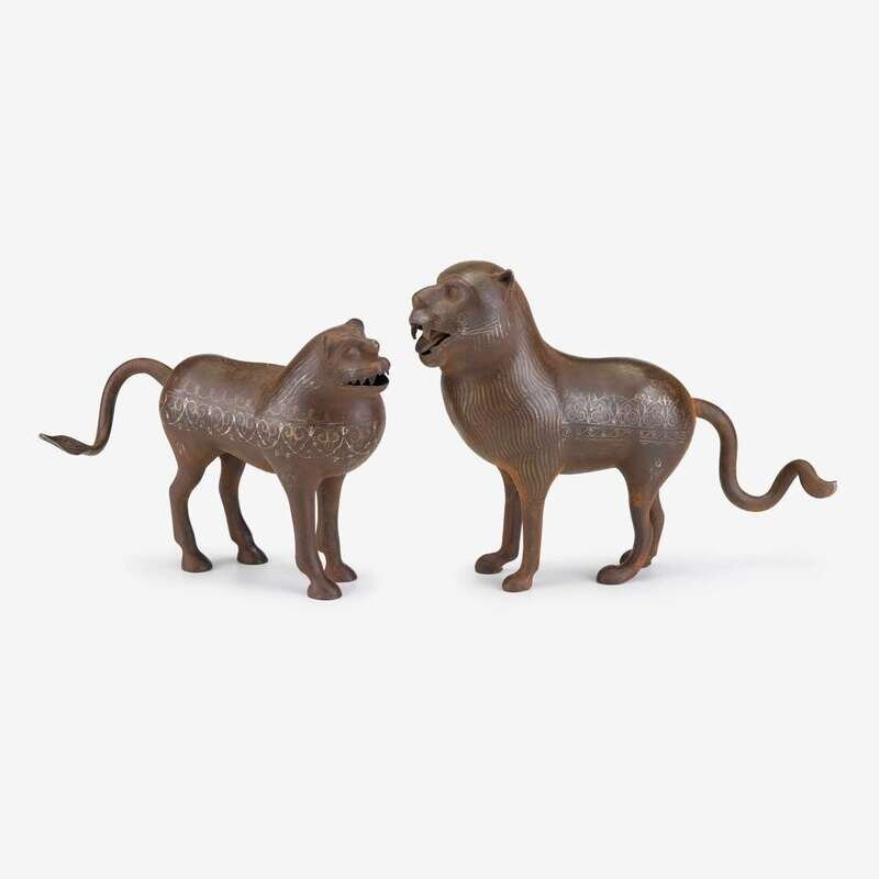 Pair of Persian damascened iron models of lions Qajar period, 19th century
