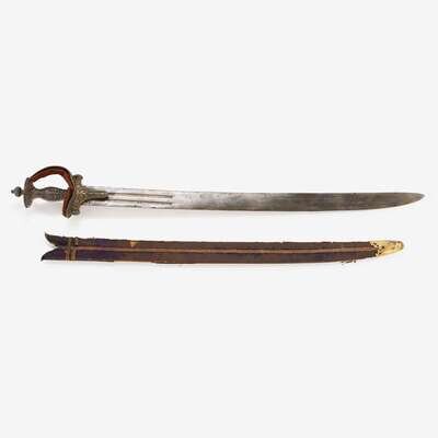 Curved single edge blade, the forte with two short fullers engraved to each side with inscriptions including "London" and "August 10 1880", mounted with Indian tulwar form hilt (probably earlier and associated), cast with reticulated arabesques within beaded borders, retaining traces of original gilding, the grip similarly decorated, in original purple velvet scabbard.