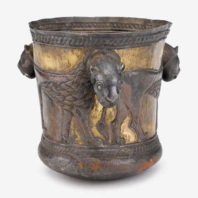 Parcel gilt metal cup decorated in repoussé and etched to show three lions with protruding heads, the heads cast in high relief and attached to the vessel by rivets.