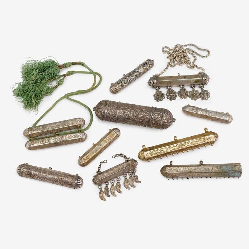 Including one suspended from a chain and fringed with five flower heads, a second fringed with seven leaves, a cylindrical holder decorated in repoussé and mounted with turquoise cabochons at each end, and seven others, each with calligraphic inscriptions, two joined by a cord. (11).