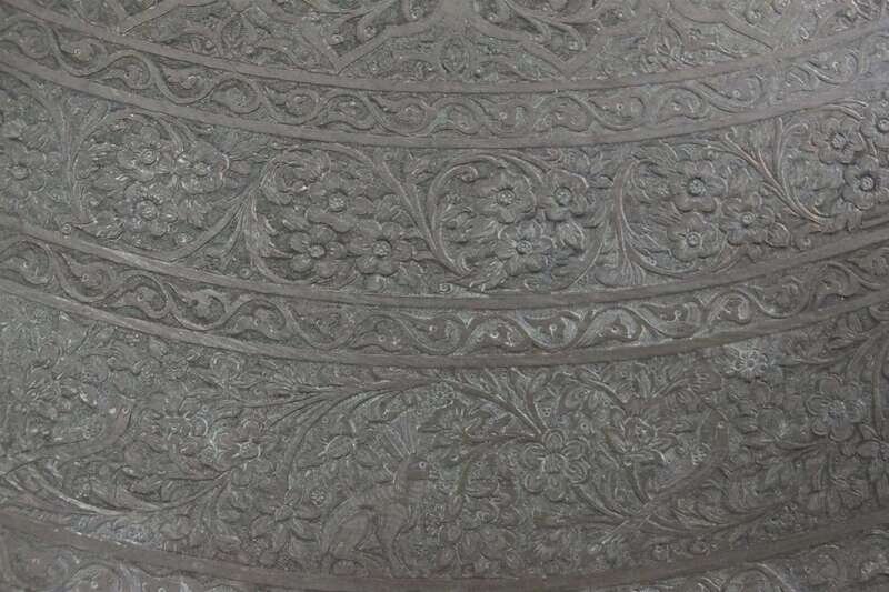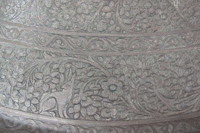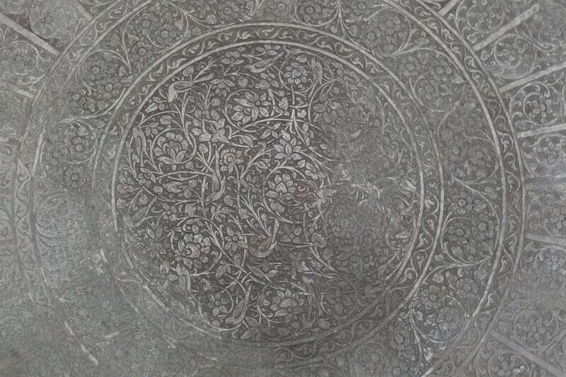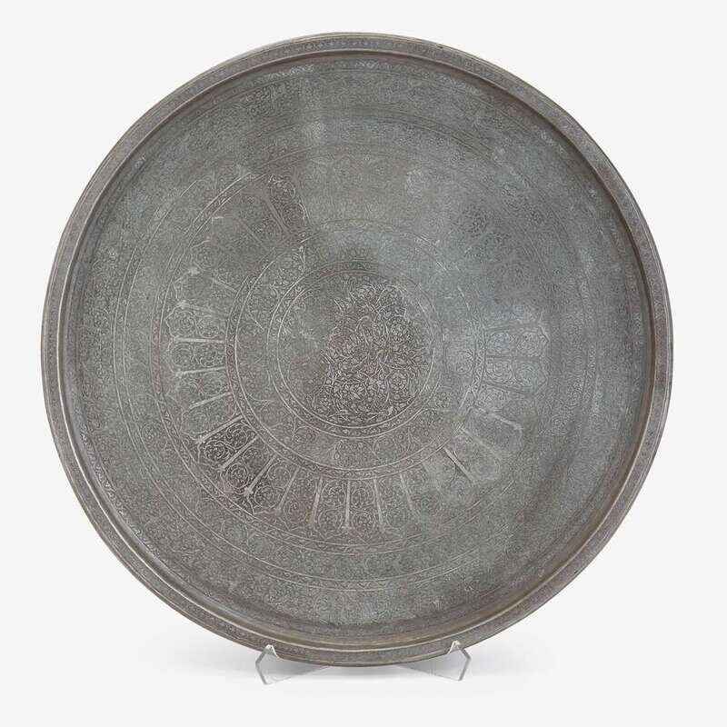 Circular form, engraved with concentric circles decorated with arabesques supporting birds and hares.