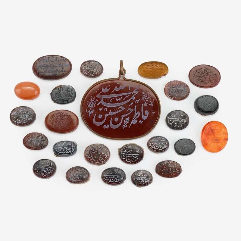 Various sizes and stones including carnelian and agate, the largest mounted as a pendant, each incised with qu'ranic or devotional verses in calligraphy. (approx. 24).