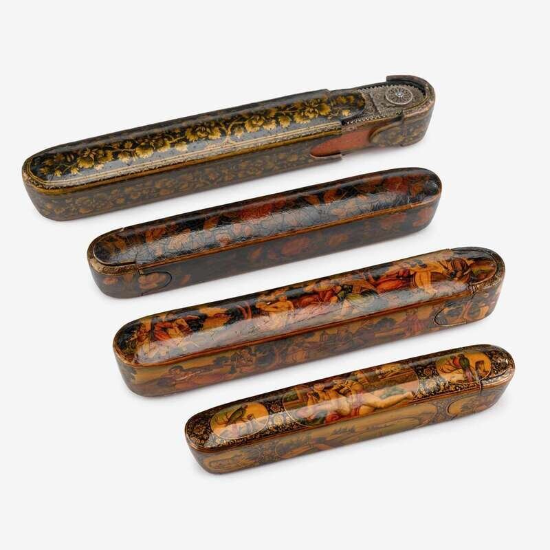 Good group of four Qajar lacquered papier-mâché pencases, qalamdan Persia, 19th century