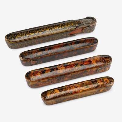 Rounded ends with sliding trays, one decorated in the gol o-bolbol pattern, another with gilt foliate designs and containing filigree inkpot and spoon, and two others with figurative designs, one with two filigree inkpots. (4).