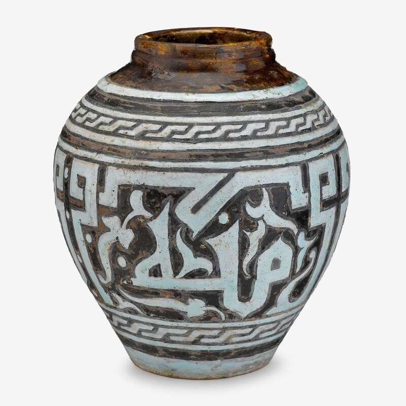Tapering ovoid form, carved and glazed to show an arabic inscription within geometric borders, with signature to the interior, the base with old retailer's label and U.S. Customs entry sticker for the 1939 New York World's Fair.