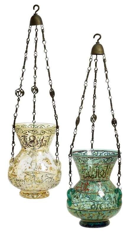 Two Islamic Mamluk style enamel glass hanging mosque lamps late 19th century