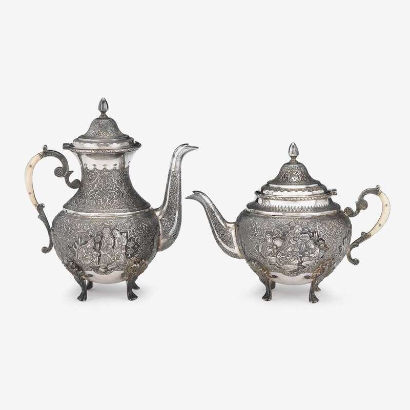 Baluster and spherical form, each engraved and decorated in repoussé with medallions depicting figurative scenes against arabesques, the underside with maker's mark, and further marked Khosrow, 84 standard. (2).