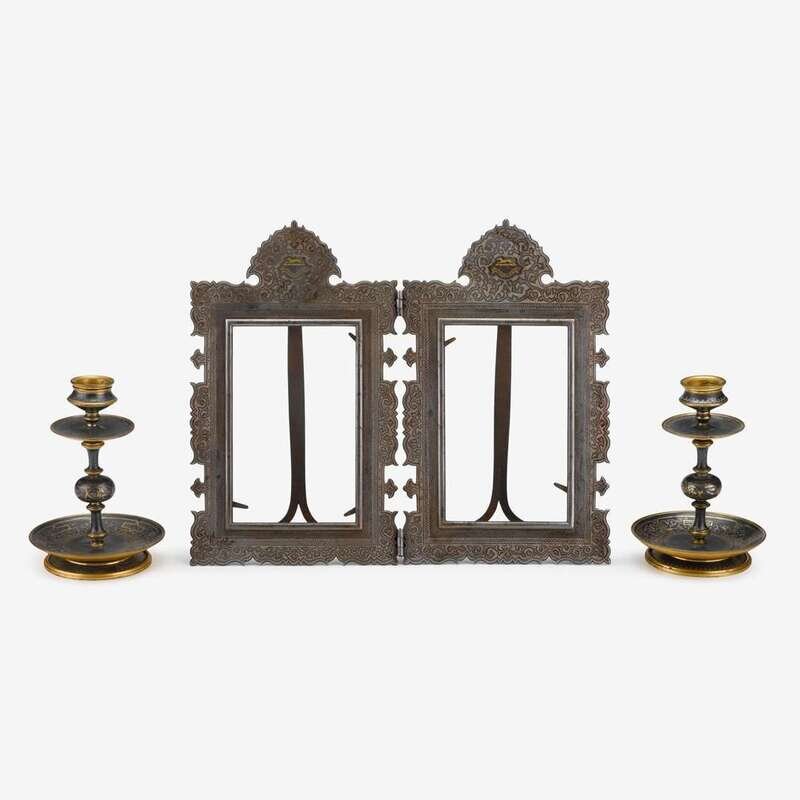 Spanish gold and silver-damascened frame and candlesticks 19th century
