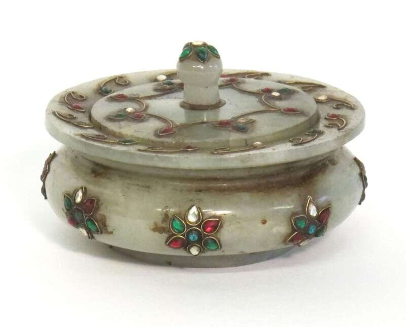 Compressed circular form, the cover decorated with wire enclosing cabochons to show a foliate tendril encircling a central blossom surmounting the finial, the box with further tendrils and blossoms.