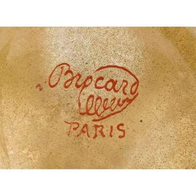 Bottle form, the elongated neck enameled and gilt with arabesques centered on palmettes and applied with a wavy collar, the globular body similarly decorated, raised on a spread foot, the base signed Brocard Paris.